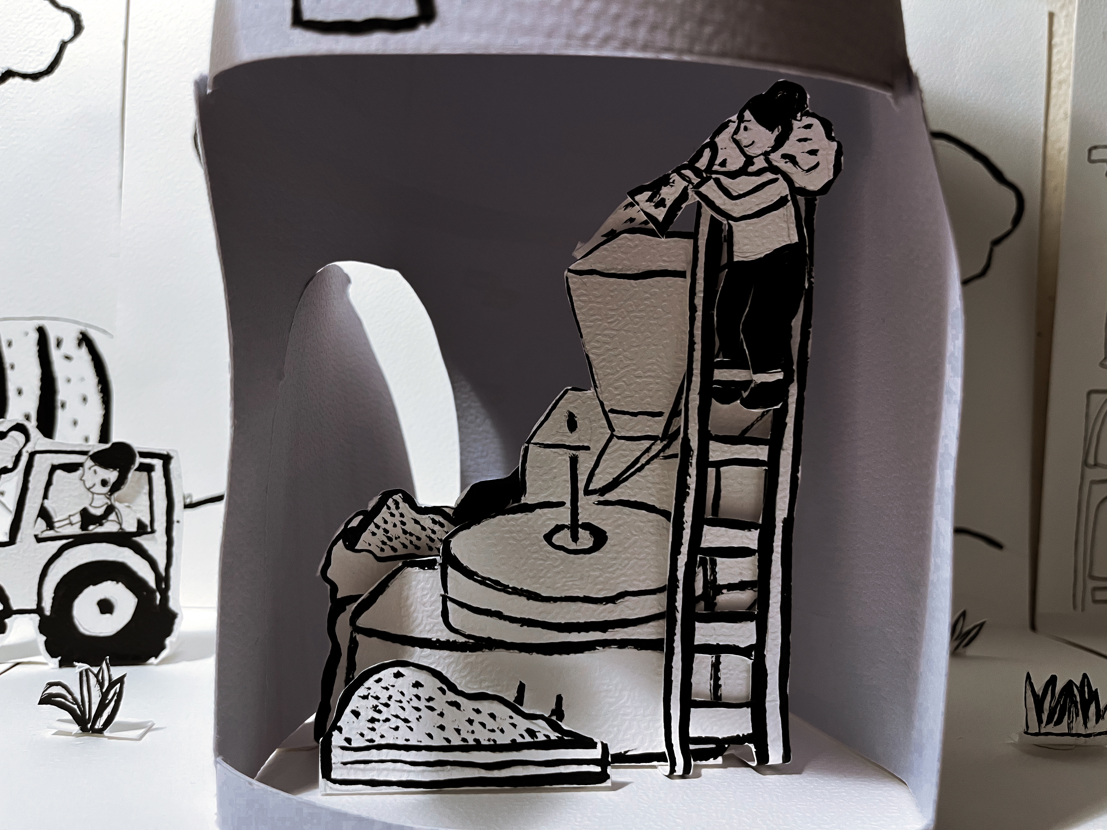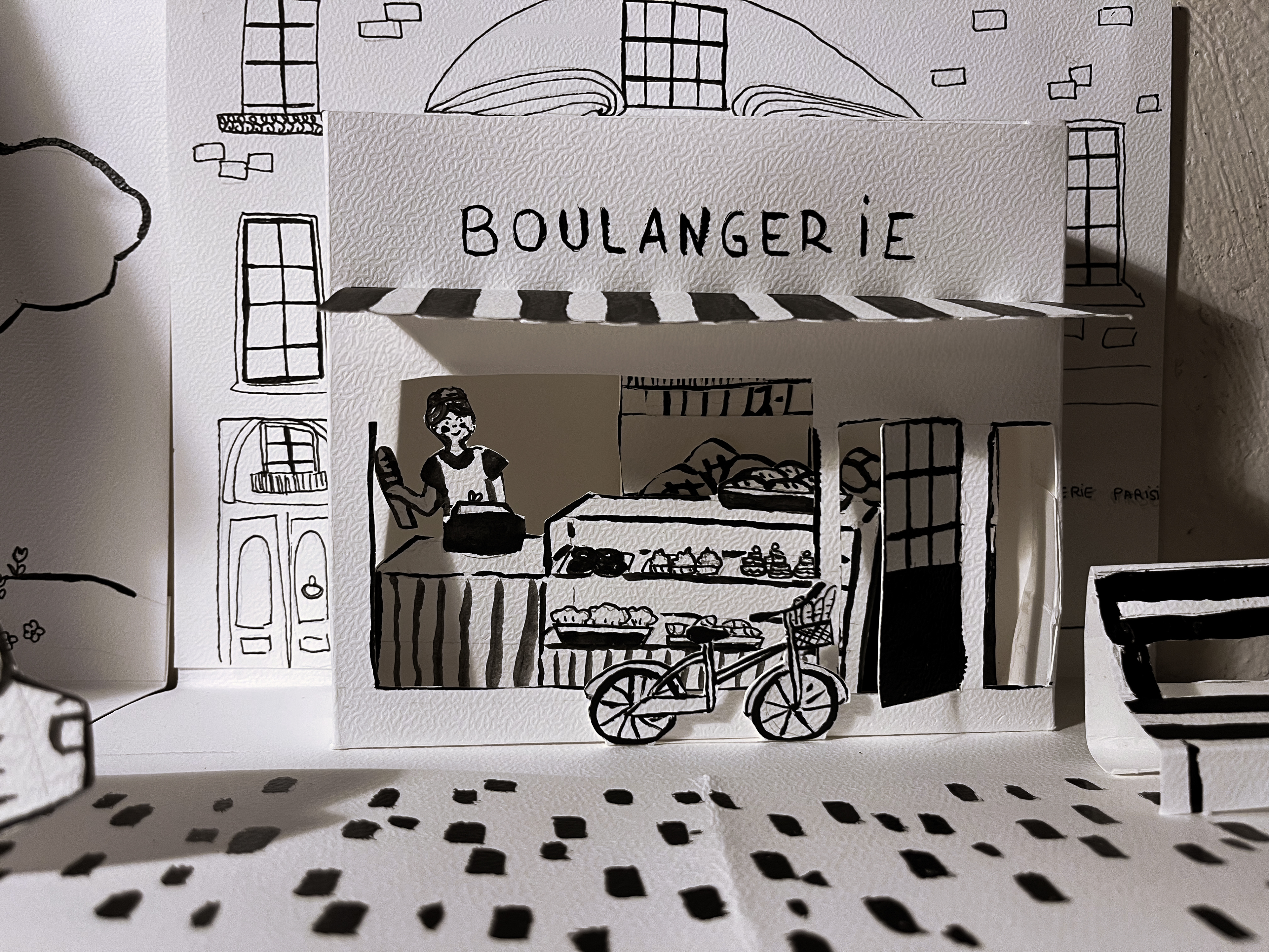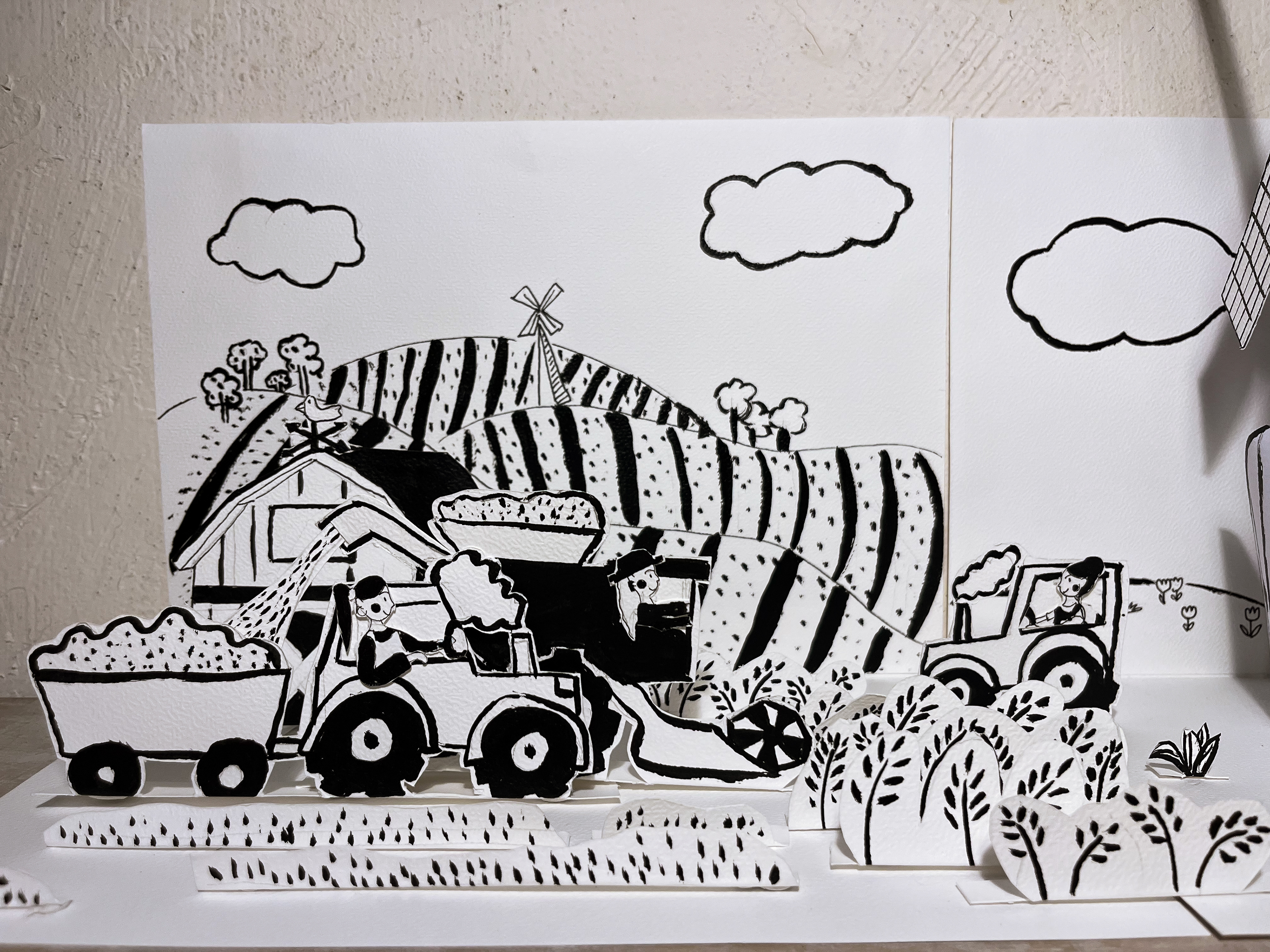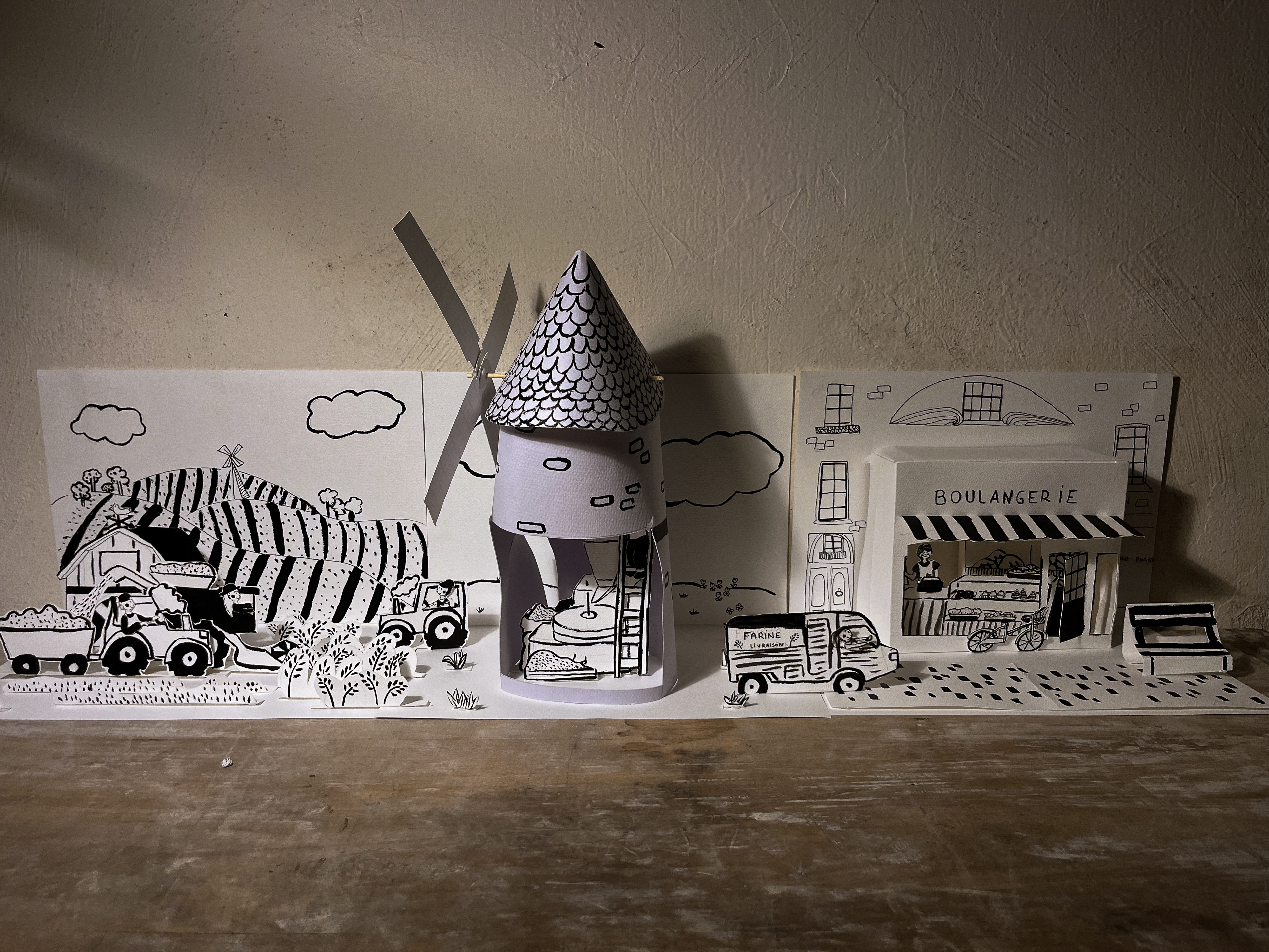 Réalisation d'une maquette papier, peinte à l'encre de Chine, et racontant l'histoire du pains, de la culture du blé à la baguette en passant par la meule à grains.