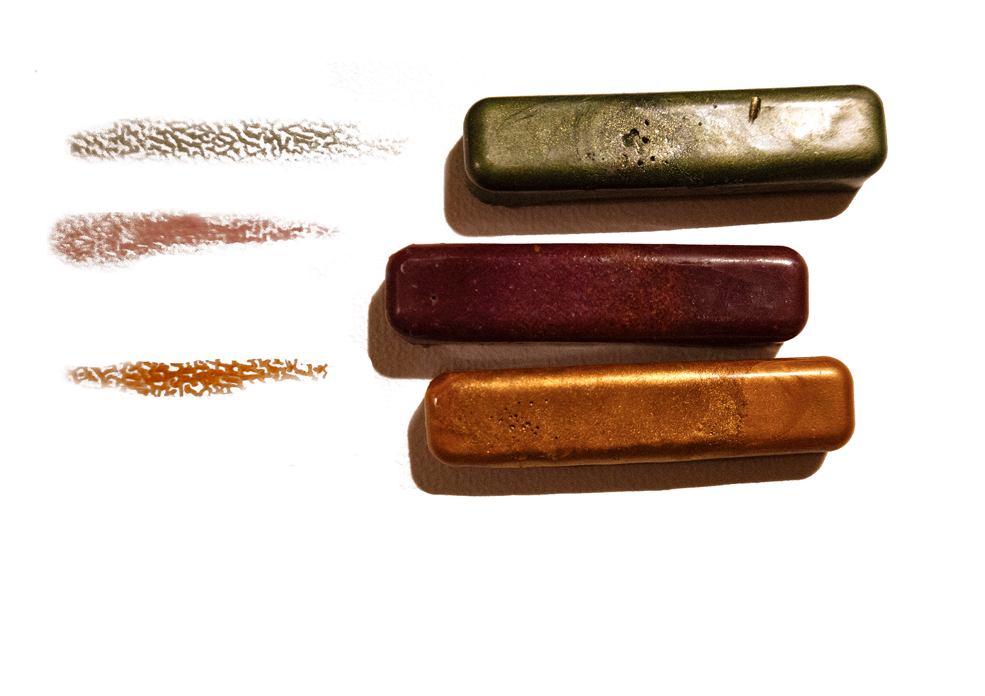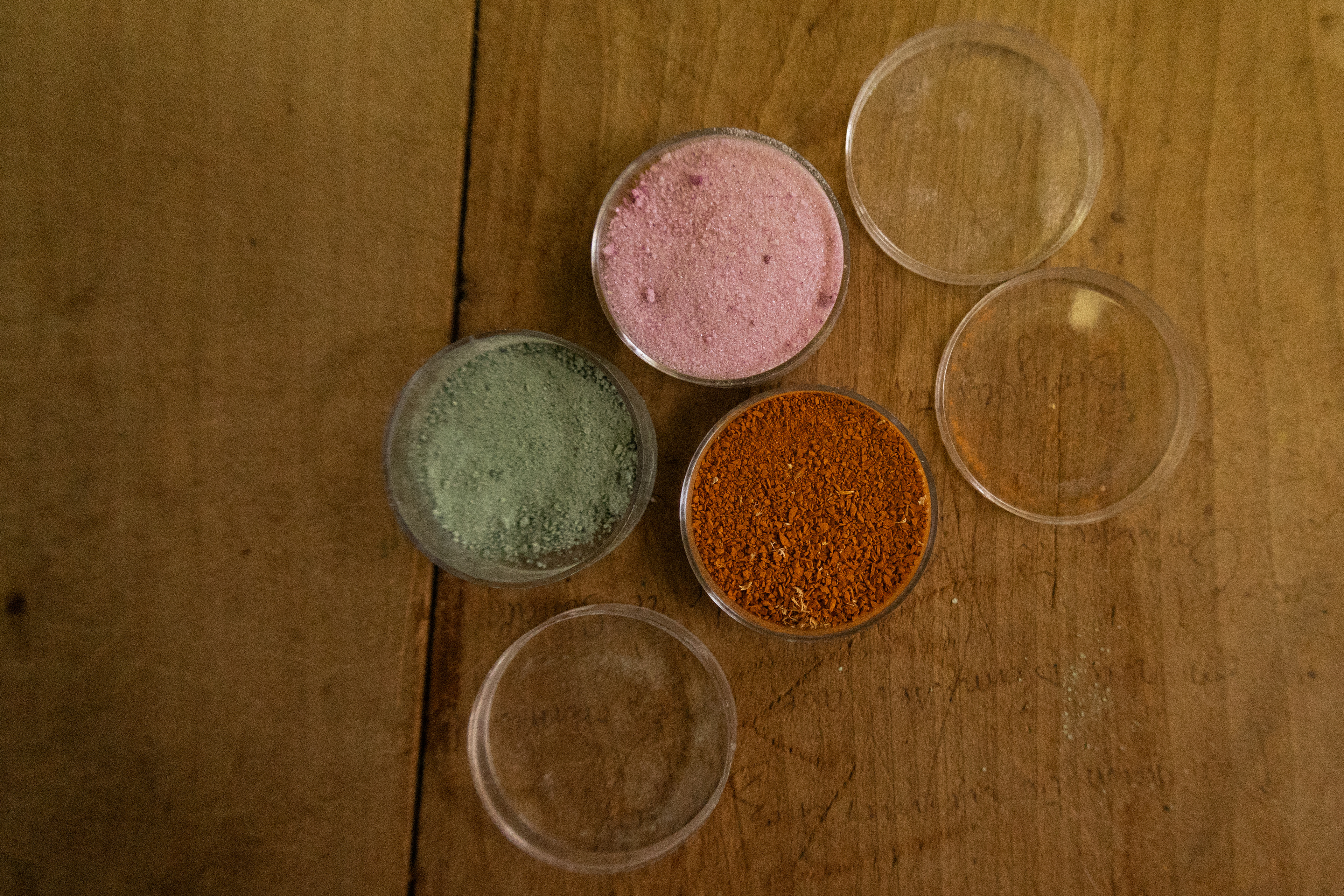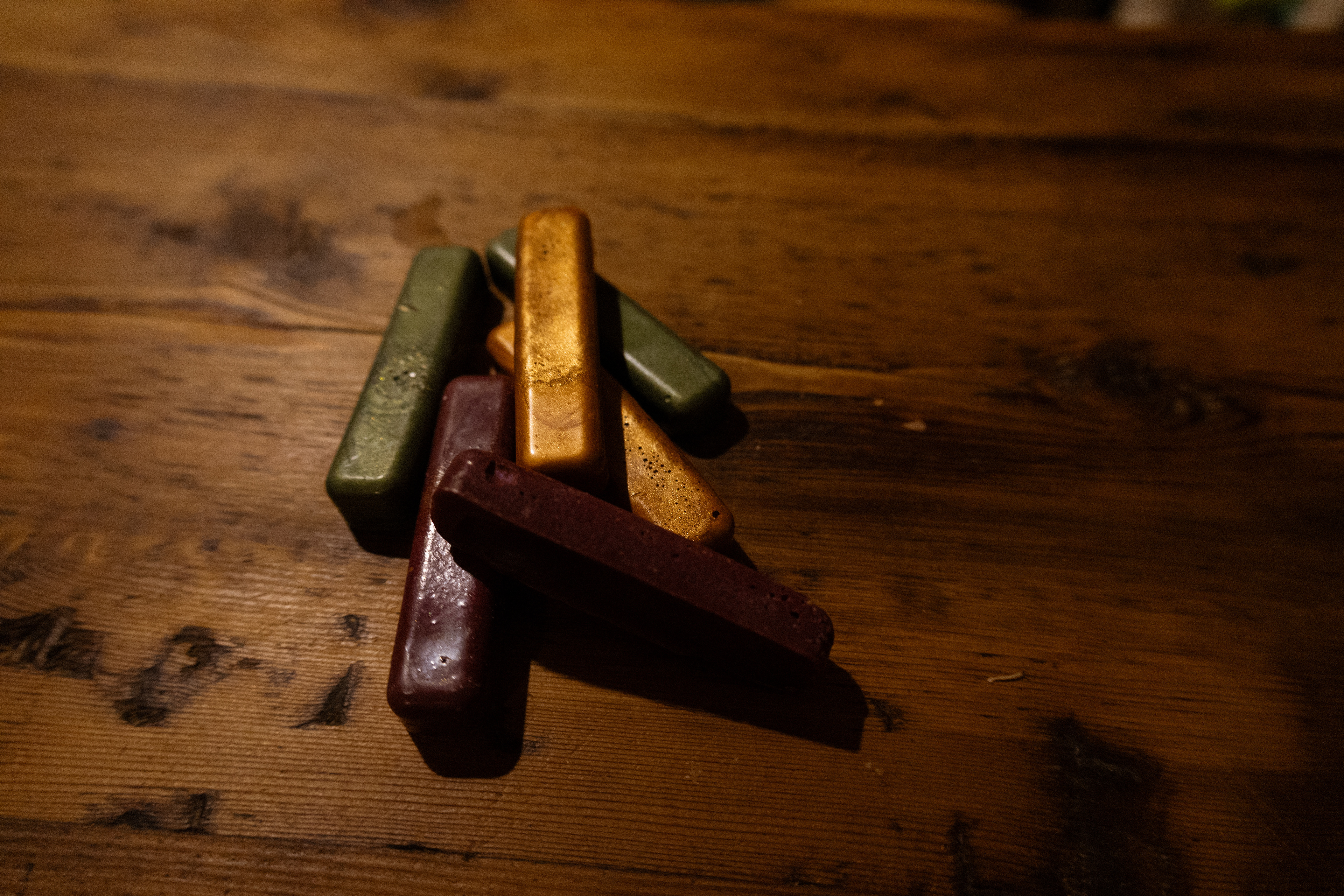 Leur fabrication repose sur l’extraction de pigments naturels, puis transformés par un processus de séchage, de cuisson, de filtration et de mélange à la cire d’abeille. L'utilisation de la cire d'abeille ajoute une dimension symbolique en plus : c'est l'abeille qui, par la pollinisation, participe à la reproduction des fleurs.